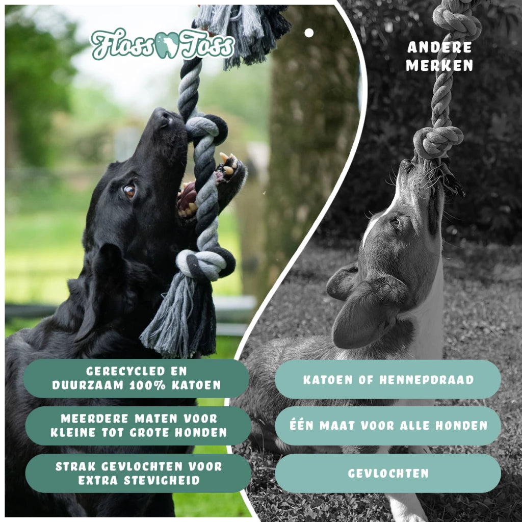 Dit geweldige flostouw is gemaakt van 100% natuurlijk katoen, waardoor het veilig, duurzaam en milieuvriendelijk is. Het is speciaal ontworpen voor apporteer- en trekspelletjes met honden. Tijdens het spelen helpt het flostouw niet alleen om de gezondheid van de mond van je hond te verbeteren, maar ook om de tanden en tandvlees te reinigen. Dit komt door de speciaal ontworpen vlechtwerktechniek die gebruikt wordt, waarbij alleen hele draden worden gebruikt, waardoor het flostouw strakker gevlochten is en veel sterker dan reguliere flostouwen. Bovendien is het gemaakt van gerecycled materiaal, dus het is niet alleen goed voor je hond, maar ook voor het milieu.