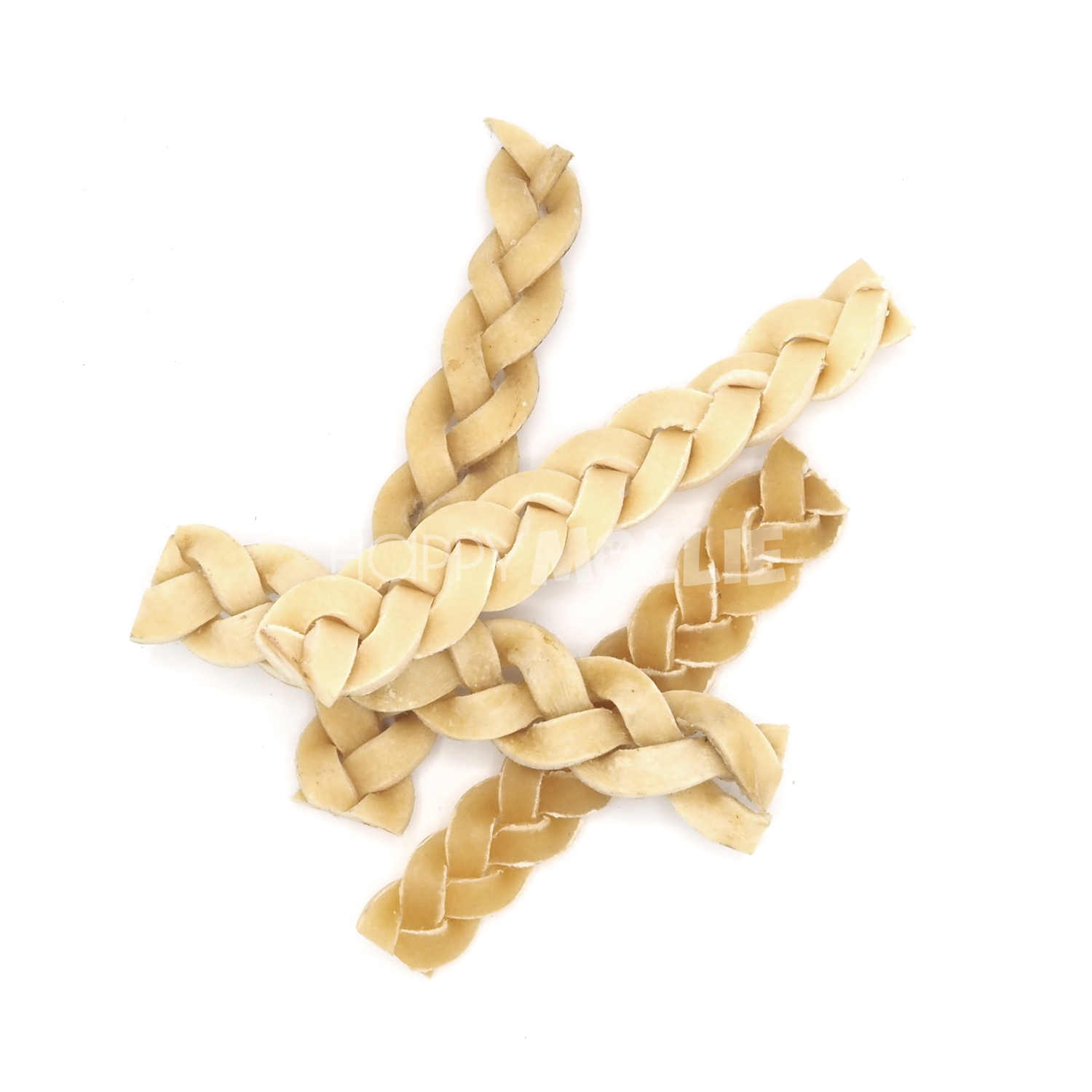 De gevlochten buffelhuid wordt verpakt per 250 gram en bevat circa 10 stukken van 15 centimeter.