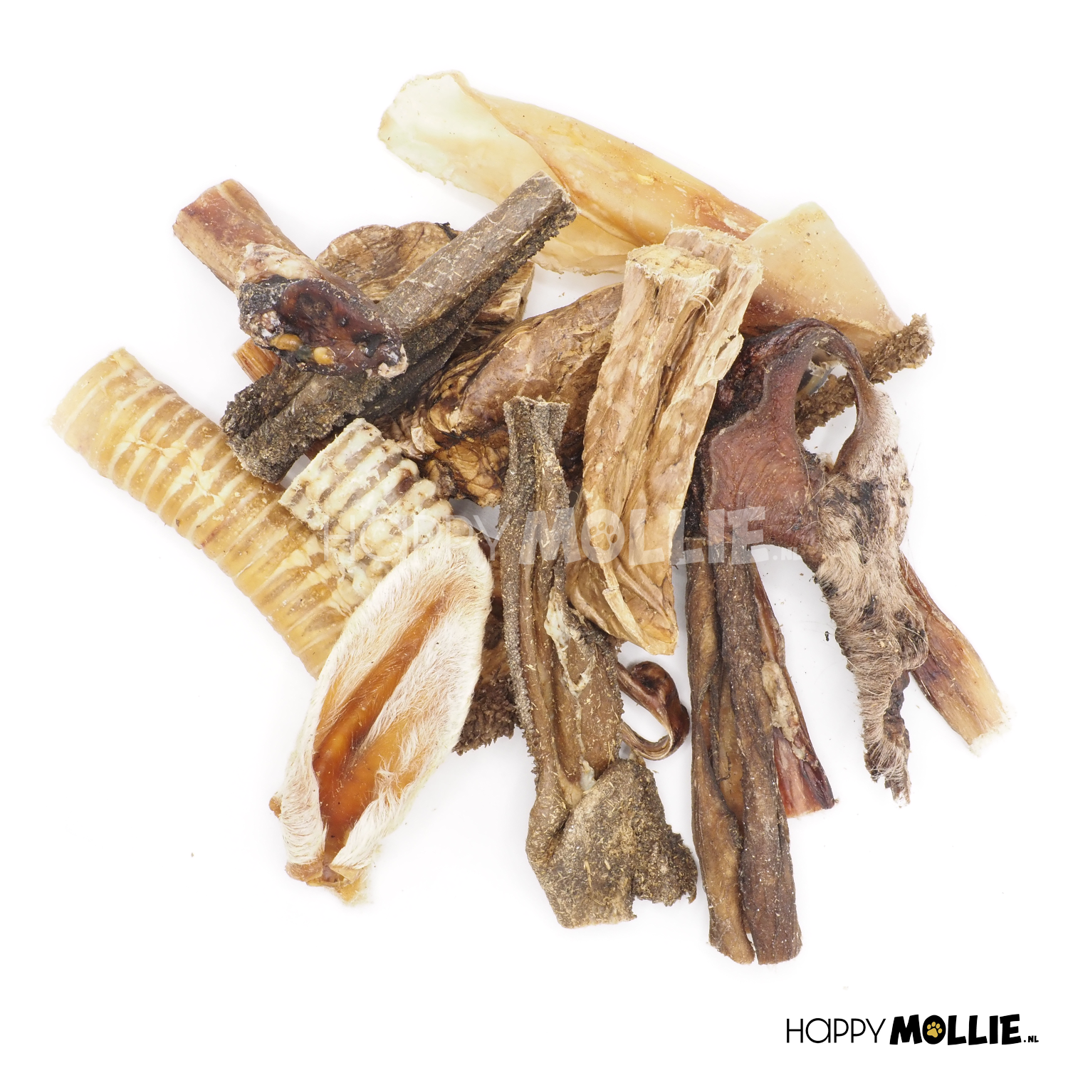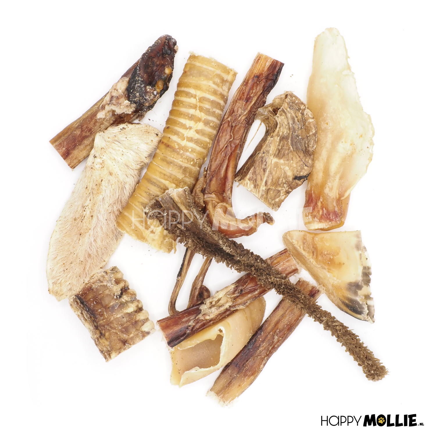 Dit snackpakket is speciaal samengesteld voor de grote en middelgrote rassen en bevat circa 750 gram harde snacks van uitsluitend rund en lam, die zorgen voor langdurig kauwplezier van je viervoeter. Omdat het pakket bestaat uit 100% natuurlijke producten kan de samenstelling wisselen, maar wat je kunt verwachten is een selectie uit: