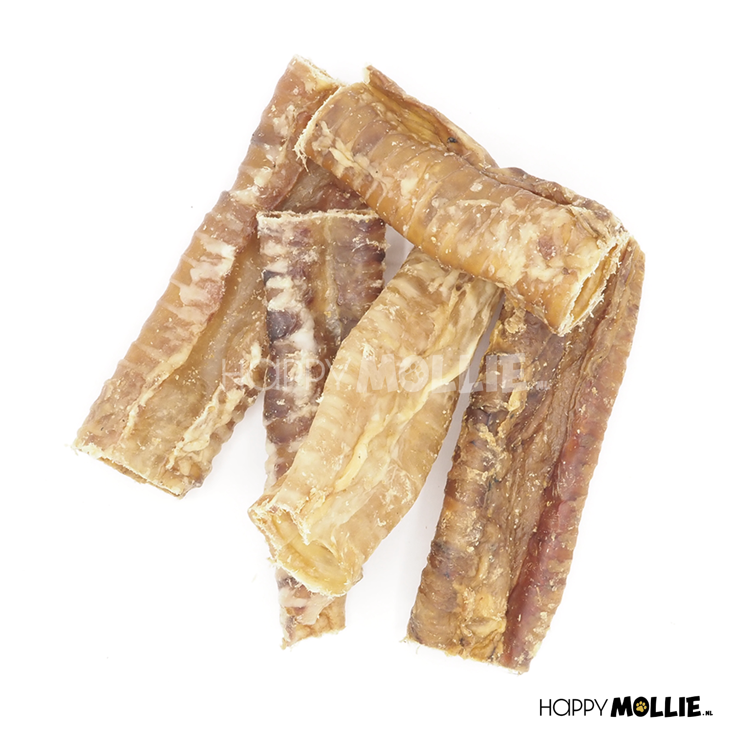 Deze runderluchtpijp wordt geleverd in mooie stukken van 12-15 centimeter in een verpakking van 250 gram